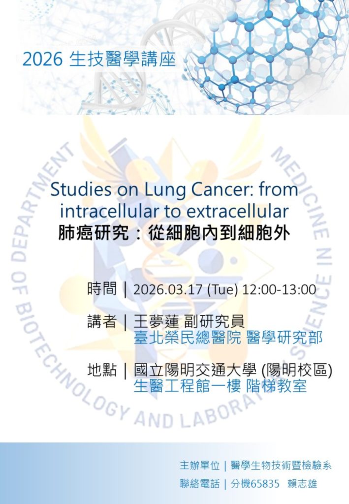 3/17 [醫技所生技醫學講座] 臺北榮民總醫院 醫學研究部 王夢蓮 副研究員 講題: 肺癌研究:從細胞內到細胞外