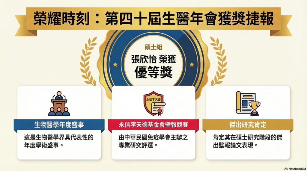 【賀】蘇美慈老師實驗室研究生”張欣怡”獲永信李天德基金會壁報競賽優等 / 公告, 活動 / By ed0816 【狂賀】恭喜 研究生 張欣怡 榮獲學術佳績! 熱烈祝賀 張欣怡 於「第四十屆生物醫學聯合學術年會」中表現優異,憑藉出色的研究成果,勇奪「永信李天德基金會壁報競賽 碩士組優等獎」!